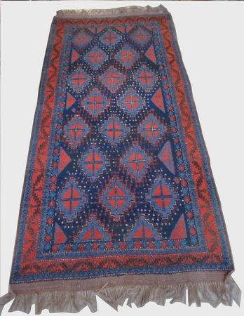 Antique Afshar rug from the early 20th century, circa 1910. Hand knotted from blue and red wools. The border has a maroon pattern on a blue ground. It measures 10'6" by 5'.