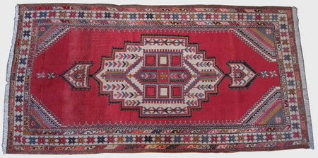 Antique Afshar style persian hand knotted rug. Bright pinks dominate the design with accents of orange, white, brown, and other colors. THere is a large central medallion and an intricate border. It measures 8'2' by 4'4". Early 20th century.