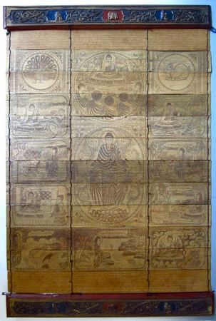 Beautiful antique Burmese Sutra, printed on leaves depicting different stories of the Buddha with his teachings. With fine printed writings on the back side and around the edges. Incised and stained with ink. Held together with lacquered and gilted wood with a raised scrolling leaves designs, lions and elephants. Age: Late 19th Century / early 20th century. Size: 19" length x 28.5" height.