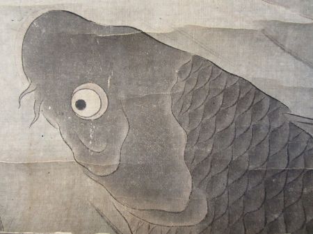 Beautiful Japanese antique scroll painting depicting a scene of two large koi fish jumping up a waterfall, the traditional image symbolizes perseverance and aspiration, painted in ink and very light color on silk, Edo Period.