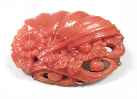 Japanese brooch made from coral, beautifully carved into a fan surrounded by flowers, leaves, and swirling winds, with a goldtoned metal backing and fastener. 19th century Size: 1" tall, 1.5" wide