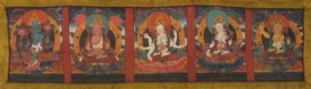 Beautiful Tibetan painting depicting white Tara and four other bodhisatvas, originally this was a book cover for a sacred text, painted in mineral colors on canvas and mounted like a thangka. 18th century.