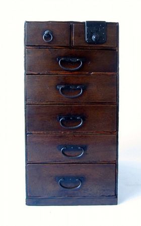 Charming and small Antique Japanese Merchant's Box. From Edo Age period (1603-1868). Box contains seven drawers. Two drawers are half sized at the very top, one of which displays a lock. Drawers are longer than they are wide, making this box able to fit into small areas.