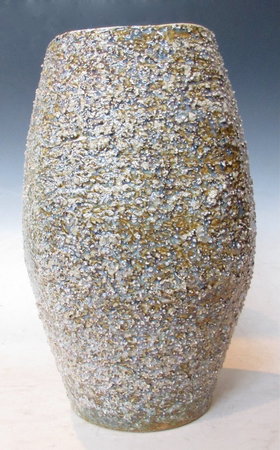 Japanese contemporary ceramic vase for ikebana, or flower arrangements. It has a very interesting, gritty textural surface and color scheme of blues, purples, and brownish-greens. The interior of the vase is slightly ribbed with vertical lines going down its sides, with a yellow/brown/green and blue glaze. Signature on bottom. It comes with its original signed wooden storage box. Wonderful Condition