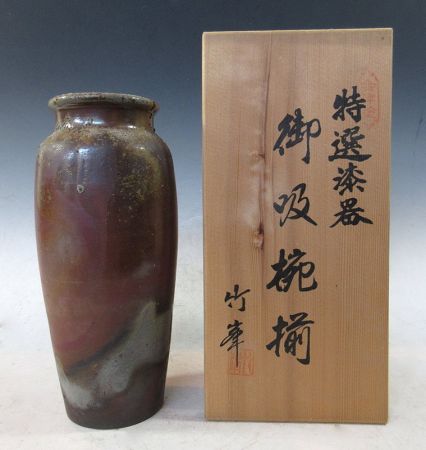 Japanese ceramic vase with a slender form, reddish brown base colors, areas with black, grey, yellow, and brown glaze and areas of texture. The artists' signature is incised into the bottom of the vase. Included is a wooden storage box with kanji.