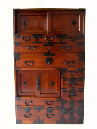 Antique Japanese Two Section Kansai area Choba Tansu. Many drawers, and two sets of sliding panels. Miniature version of a regular size two section tansu, making this piece rare for its size. Beautifully finished hinoke wood throughout tansu, with dark iron locks, handles, and fixtures. Tansu comes with original key that unlocks door on bottom right. Good condition, and wonderful rich color of wood. Wonderful Original Condition from Kansai Area.