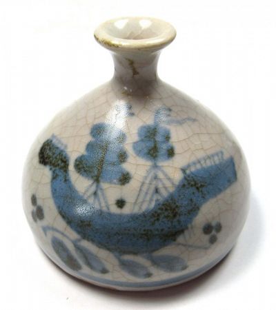 Antique Japanese porcelain bottle, with a light beige crackle glaze, and blue underglaze designs of a sailing boat floating atop of waves, and a solid blue ring around the base. The bottle is stout with a thin opening, for pouring aromatic oils onto one's hair. 19th century