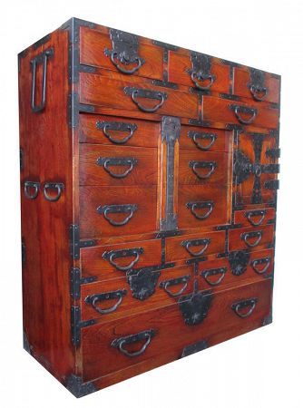 Rare Japanese keyaki wood choba tansu with 15 exterior drawers (3 interior drawers) and a locking bar, keyaki (elm) wood front and frame with dramatic grain and lacquer finish, elaborate iron metal wood including moko shaped drawer pulls, locking bar has iron work with bamboo motif, the safe box has a key and the three small drawers on the inside are made all of kiri wood with handles to match the front exterior, Edo Period, Makuni area.