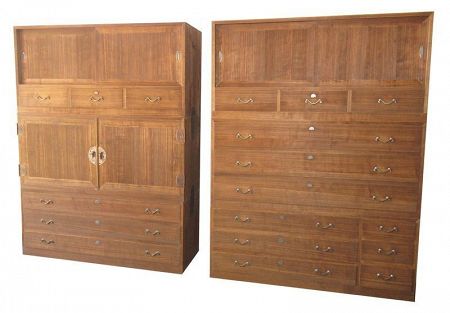 Antique Japanese pair of three-section kiri (paulownia) wood tansu, with metal hirute shaped handles and fan-shaped locks on multi-sized drawers. The top section of each tansu has two large sliding doors, with inner shelving carved in an attractive alter style and two small drawers. One tansu has a middle section with two large doors on attractive hinges incised with a motif of kiri leaves, and a round pierced metal decoration with kiri leaves and flowers. Inside are four sliding drawers for the storage of kimonos.