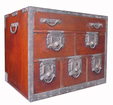 Antique Japanese cho bako made of keyaki (elm) wood with beautiful grain and original translucent lacquer finish, iron hardware including edge bracing, lock plates, hirute shaped drawer pulls on the front, warabite shaped handles on the sides. Five drawers with one drop in panel and hidden compartment. Comes with one key. From the Sakata area of Japan. Edo Period.