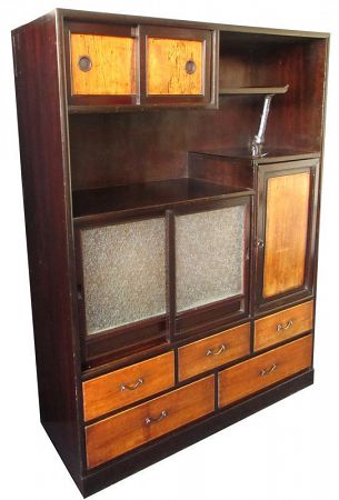 Antique Japanese cha tansu (tea storage cabinet) made with a gorgeous lacquered hinoki (Japanese cypress) frame, and persimmon wood front panels. It has an open display shelving area with a branch accent, original glass panels, iron hirute handles, and plenty of storage space. Taisho period (1912-1925)