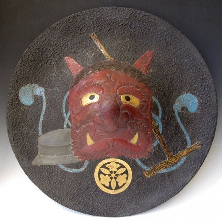 Unusual Antique Japanese maki-e lacquer Jingasa (Samurai helmet) decorated in low relief lacquer work of a fierce looking red Oni with piercing gold eyes and teeth . A gilt lacquer mon, or family crest is seen below the Oni representing daffodils. The underside of the helmet is smooth, shiny black lacquer.