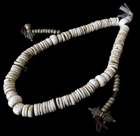 Antique Tibetan Mala prayer beads, made with beads of conch shell strung on leather cord. Two leather tassels hand from its sides, with beads of white brass, ending with two highly important symbols in Tibetan Buddhism; a Vajra and a bell. Tibetan malas are comprised of 108 beads, used to count the number of times a mantra is recited during meditation. 19th century