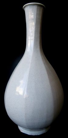 Antique Korean porcelain bottle of an octagonal faceted form, with long neck fluting slightly at the rim, covered in a translucent crackle white celadon glaze. The foot is deeply recessed with buff edges.