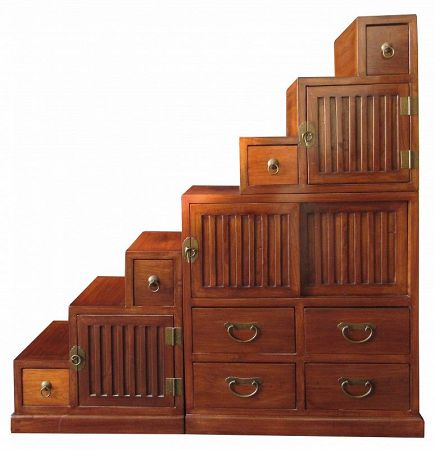 Japanese contemporary Kaidon tansu known as a step tansu. Comprised of three sections. Made with solid Keyaki (elm) wood, this tansu will hold many precious things within its various size drawers and compartments. Each compartment opens from both sides, so this Kaidon can be facing either direction. Its doors feature vertical slats to create an interesting contrast of texture and design. The brass hardware adds subtle decoration such as lotus pod backplates with ring pulls and scrolling warabite handles. Overall a very functional and attractive piece.