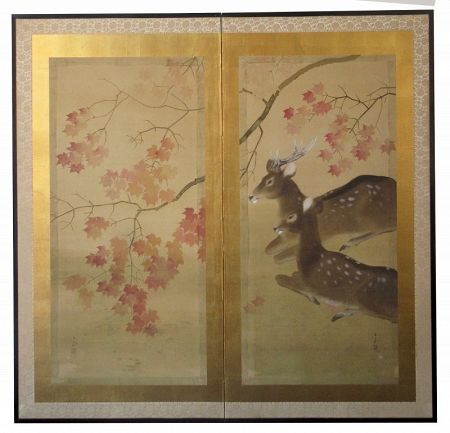 Japanese 2 panel byobu screen painting on silk, of a male and female deer resting below a maple tree. Each panel is bordered in gold leaf and signed "Kagayama Hakuho" with a red chop.