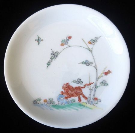 Antique Japanese small porcelain Kakiemon ware dish. With enamel scene of a tiger chasing a flying bird, bamboo and scholar's rocks, accented in gilt. Slightly flared rim with the recessed foot left unglazed around the edges.