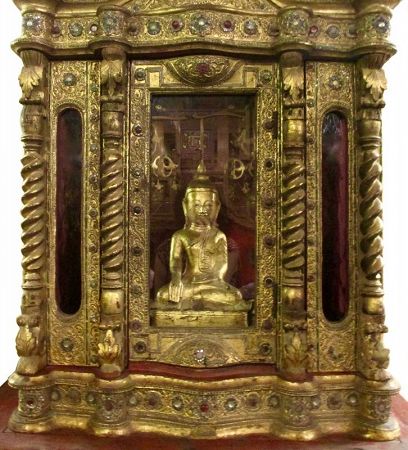 An elaborate and intricate Burmese shrine or altar. The shrine proper is encased in clear glass and sets upon a large enclosed cabinet, most likely for storing devotional items. High relief, gilt dry lacquer has been molded in scrolling floral and foliated patterns. Glass "gems" have been further inset into the design for even more opulent style. A pair of emerald green glass panels have been inset on either side of the mirrored central door. The cornice features an armorial crest of a crown and shield, lion and horse, and flags and figures.