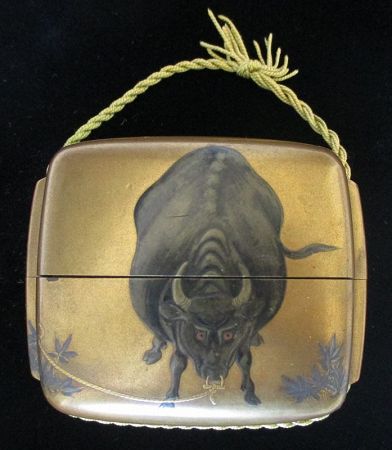 Japanese inro with a large standing bull, frontally positioned with head lowered and looking ahead at the viewer. From the ring in his nose is a rope leading off to the side. The reverse image is a scene, entirely in gold lacquer, of rolling hills and pine saplings in the foreground. The inro opens to reveal a compartment lacquered red on the inside with a small removable inset tray.