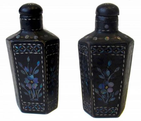 The pair of snuff bottles have a hexagonal faceted shape with flattened foot. They are inlaid with iridescent shell floral motifs with dark brown lacquer wood.