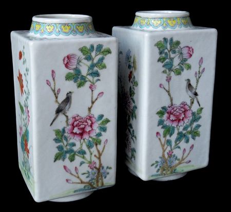 Chinese pair of antique porcelain canton style vases of a squared body. Each vase decorated in mirrored enamel scenes of chrysanthemums, peonies, birds, and other nature motifs.