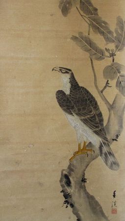 Antique Japanese scroll painting of a hawk standing on the branch of an oak tree. The hawk is detailed with great attention to every feather. Painted in sumi ink and light colors on paper. Signed Shunkei with seal, possibly Mori Shunkei (1775-1841).