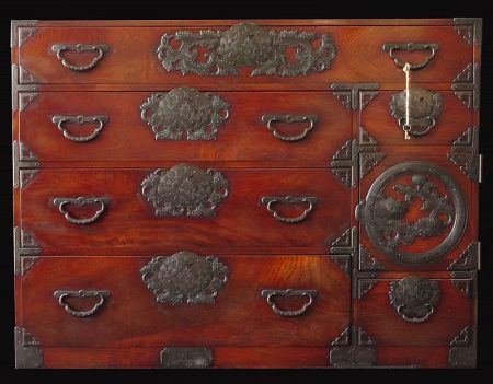 Japanese solid Keyaki isho tansu from the Sendai region. With original deep red lacquer finish. The interior of the drawers done in black lacquer. With black iron hardware incised with floral motifs, large lock plates with chrysanthemums and open work scrolling leaves, the small corner safe door adorned with a round open work iron plate with peonies and scrolling leaves, opening to two small interior drawers for precious keepsakes.