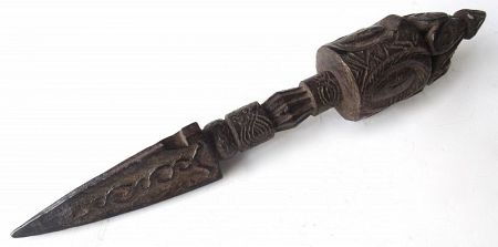 Antique Tibetan carved wooden phurba, a ritualistic Vajrayana Buddhist implement, depicting Nagas or snakes on the blade. Nagas are the entities in nature that associated with illnesses. The entwining serpents are a symbol of medicine and healing. The deity handle, mirroring the three-edges of the blade has three deity faces. Typically, one might be wrathful, one peaceful and one joyful representing Body, Speech and Mind.