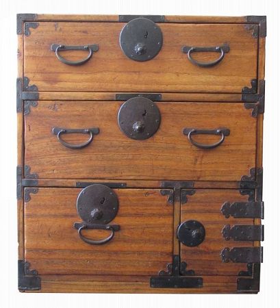 Antique Japanese small ko tansu for personal use. Made of kiri (paulownia) wood with iron hardware. Three large drawers and a small safe box in the lower right hand corner. Inside the safe box are two small drawers. Iron hardware includes round lock plates, warabite shaped drawer pulls, and corner bracing.