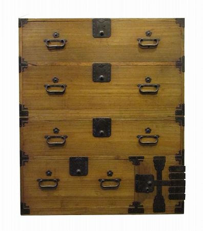 An antique Japanese 2 section Kiri Kasane Tansu (stacked chest on chest) with handmade iron fittings. Bottom section features a hinged door behind which houses 2 small drawers). The top of each lock plate displays a stylized Chrysanthemum while above each handle has a plum blossom Ue Atari (upper handle stopper).