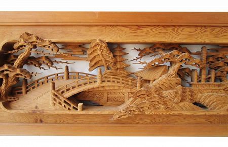 An antique Japanese Ranma (transom) that was highly detailed and hand carved out of Akita Suginoki (Cryptomeria from the Akita region) with a Hinoki (Cypress) frame. It features a landscaped Shinto shrine grounds complete with the shrine complex, pine trees, clouds, a Torii gate, a Pagoda, and a beautiful footbridge. The image is carved on both sides to show the front and back of the complex.