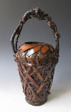 Antique Japanese tall ikebana basket for flower arranging. Woven of split bamboo of varying widths in an wild yet ordered pattern. The foot is woven of a finer bamboo twisted into a rope. The tall handle is made of beautifully gnarled wisteria branches.