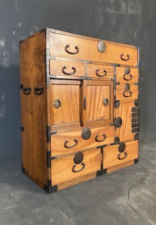 An antique Japanese Choba Tansu (merchant chest) made of Momiji (Maple), Sakura (Cherry) and Hinoki (Cypress) woods. Made with hand forged iron hardware including the Warabite handles. With 8 exterior drawers, 2 sliding doors behind which is a storage space with a removable shelf and a hinged door that hides 4 small drawers. constructed using straight dovetail Japanese joinery with hardened wooden nails. Pair of side handles to each side for ease of placement in a room.