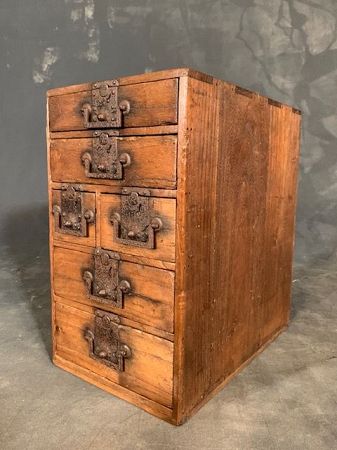 An antique Japanese Chonin Kobako (merchant storage box) made entirely of Kirinoki (Paulownia) wood. Original hand forged iron hardware with construction using straight dovetail Japanese joinery and hardened wooden nails. The drawer handles are of the Kakute style comprising six drawers to organize and secure its contents. Traditionally sitting next to the side of the merchant, it was an indispensable chest housing coins and money, important documents, and valuables as well as brushes, an inkstone and paper for writing orders and receipts.