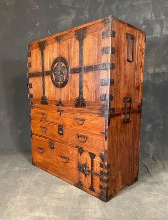 An early 19th C. Japanese two section cannon biraki clothing chest. Made of 100% solid kiri wood (all from one tree). Hand forged iron hardware. Top section has pair of hinged locking doors. Securing pair of interior drawers. Bottom section seven drawers in total teaching ranging in size (volume). Small hinged safe contains three small drawers.