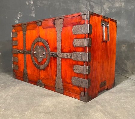 An antique Japanese Ryo Biraki Tansu made of Suginoki (Cryptomeria) wood. All original hand forged iron hardware including the Warabite handles and the natural Urushi lacquer. The two hinged doors hide 6 drawers of varying sizes. Constructed using straight dovetail Japanese joinery and hardened wooden nails.