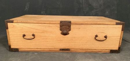 An antique low single drawer storage Kotansu (personal chest) made entirely of Kirinoki (Paulownia) wood. Original hand forged heavy gauge iron hardware. Constructed using thick wood, straight dovetail joinery and hardened wood nails. Originally used to store Kimono or personal effects, it would work well in a contemporary home as a base storage unit on a large table or credenza .