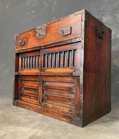 An antique Japanese Choba Tansu (merchant chest) made of Keyaki (Zelkova) and Suginoki (Cryptomeria) woods. All original hand forged iron hardware and wiped Urushi lacquer finish. A top full width drawer with two sets of sliding doors. The upper set has a spacious area where the merchant stored his business books and records. The lower set has two small drawers behind the doors and another area for more storage. Perfect for a side chest or a large nightstand.