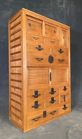An antique Japanese 1 section tall Gifu Choba Tansu (merchant chest) made of Hinoki (Cypress) and Sugi (Cryptomeria) woods. All original hand forged iron and bronze hardware including the Hirute style handles. It features 2 pairs of large sliding doors and a lift-out door behind which were kept store records and books. 12 exterior drawers were used for storage and organizing. A small pair of sliding doors near the bottom hides two small drawers where valuables were kept.