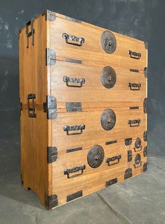 An antique Japanese Kasane Tansu (stacking chest on chest) made of Kiri (Paulownia) and Sugi (Cryptomeria) woods. All original hand forged iron hardware including the full moon lock plates and the Kakute style handles. The backplates of the handles feature the auspicious Sho Chiku Bai (Pine, Bamboo, Plum Blossom) motif. Side carrying handles to each section with rare connecting pins to secure both sections together. Constructed using straight dovetail joinery and hardened wooden nails. Age: Meiji Period (1880-1890)