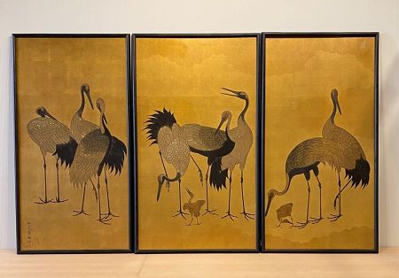 Antique Japanese Screen Painting in 3 panels of a group of cranes. 8 adult cranes stand with two chicks. They are painted large scale and stand out dramatically against an all gold ground. Painted in mineral colors and gold leaf on paper and mounted in 3 frames. The signature & seal both show the painter's name as 松究 Shо̄kyū.