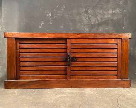 Antique Japanese todana tansu (storage chest). Large sliding panels with wide horizontal slats open to a series of interior drawers: four drawers on the right (two large and two small) and three large drawers on the left. The front and frame of the tansu is made of hinoki (Japanese cypress) wood with kiri (paulownia) wood drawers. Iron hardware includes hirute shaped drawer pulls.