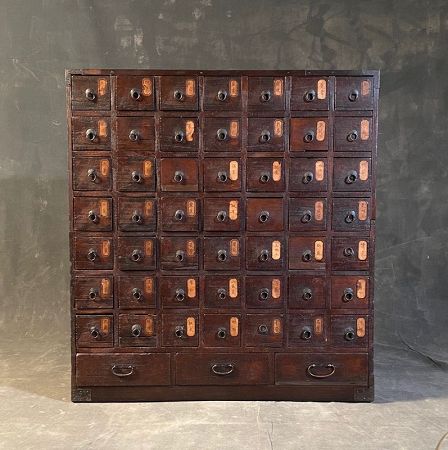 Japanese antique kusuri tansu, chest with many drawers for storing medicinal herbs for an apothecary. Made of kiri (paulownia) wood with sugi (cryptomeria) wood frame. Small hand holds cut in the sides for convenience. Each of the 49 small drawers is labeled with a paper label. Older labeling in ink can be seen on some drawers. The lower portion of the chest has three medium sized drawers. Hardware is made of iron and includes rings pulls, warabite shaped handles on the larger drawers and corner brackets.