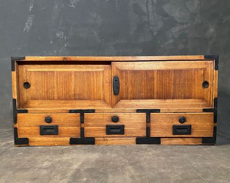 An antique Japanese Tansu chest made of Kiri (Paulownia) wood. All hand forged iron hardware. 2 sliding doors with spacious storage behind with 3 side by side drawers below for additional storage. A single section that would accent any space below a window sill or at the foot of a bed.