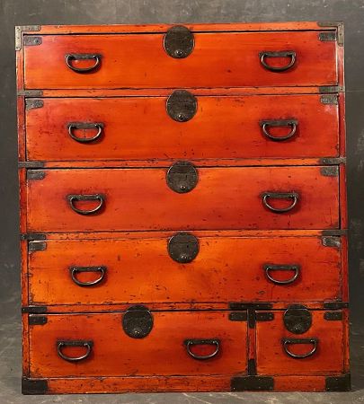 An antique Japanese Kimono Tansu made of Sugi (Cryptomeria) wood. All original Shunkei lacquer finish and hand forged iron hardware including the Warabite handles. Full moon lock plates with 6 spacious drawers for clothes storage.