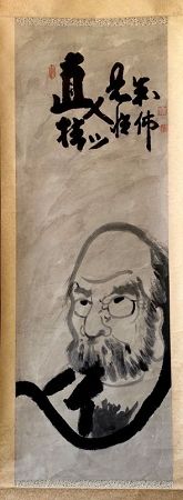 Japanese antique scroll painting of Bodhidharma with large calligraphy. The whole of the paper is painted with a light wash of ink before applying the bold image with a large brush. The red seals are actually painted with a small brush. Bodhidharma is the monk credited with founding the Zen tradition of Buddhism.
