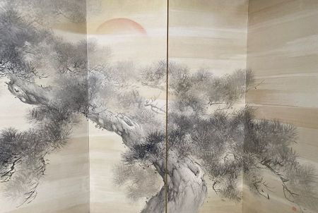 Japanese pair of byobu (folding screen paintings) with large pine trees. In one screen is the full moon, in the other the red sun floating in a misty background. Painted in sumi-e ink and light colors on paper. Signed by the artist.