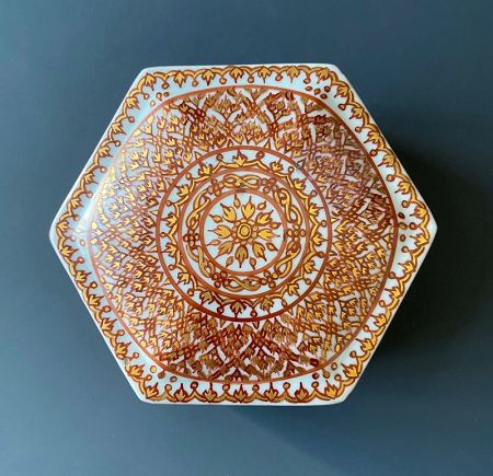 A Laai Narmthong Bencharong ware porcelain cosmetic powder/accessory box with gold and iron red enameled pattern. The intricate design was most likely painted by a court sanctioned artist. Limited edition of the Prasart Museum Collection.