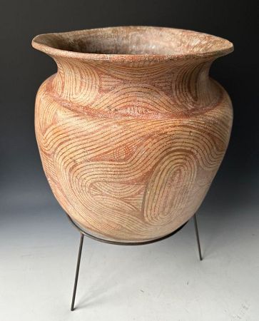 Rare large Ban Chiang earthenware pottery vessel. Geometric rope designs around a central seed pod.