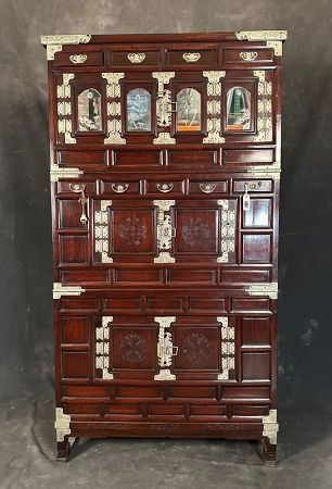 Antique large Korean 3 Section stacking storage chest. Top compartment features double hinged compartment that opens for storage inside. Set of five pull out drawers just above midway. Lower two sections has single hinged compartments for additional storage. Original finish and hardware. Locking pins for each compartment included.
